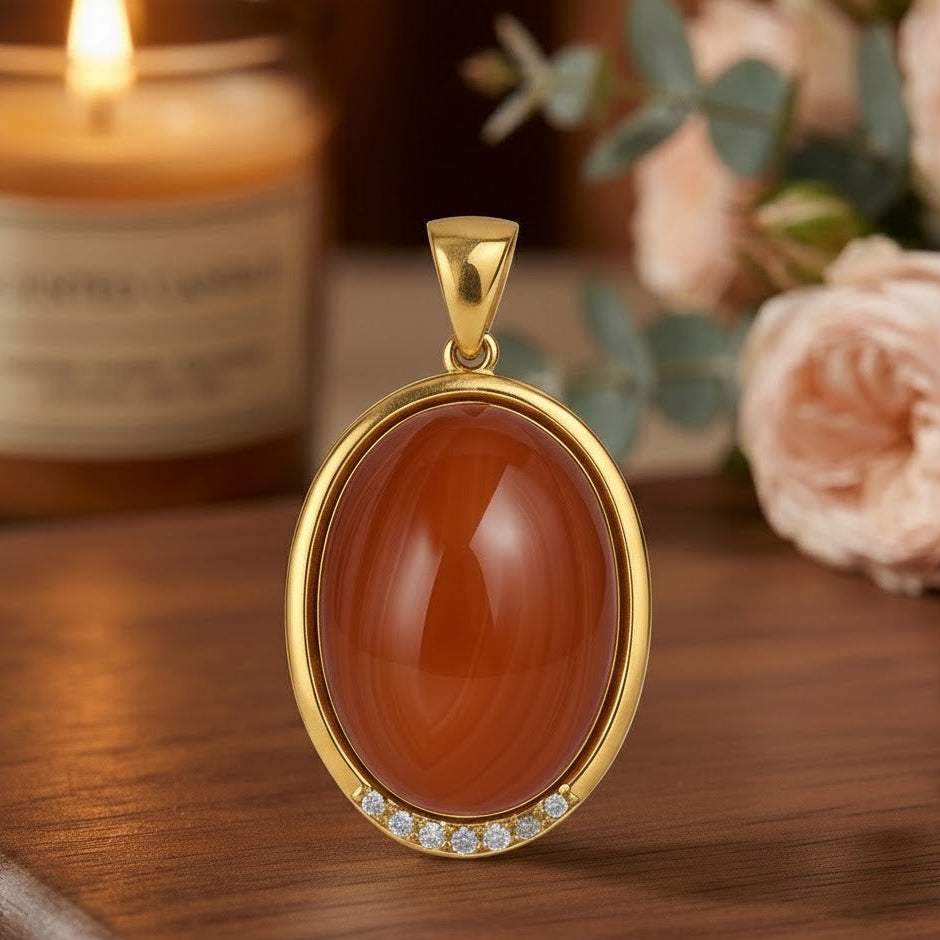 Le pendentif est un pendentif en cornaline ovale sertie de zircon. La pierre centrale est une cornaline, une variété de calcédoine connue pour sa couleur rouge-orange. Elle est entourée d'un cadre en vermeil et ornée de petits zircons, qui ajoutent une touche d'éclat au bijou.