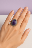 La bague présentée sur l'image semble être une bague avec une pierre de charoîte montée sur une monture en argent avec un design dentelle. La charoîte est une pierre précieuse violette connue pour ses motifs uniques et ses nuances de couleur. La monture dentelle ajoute une touche élégante et vintage à la bague.