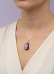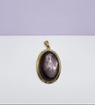 Ce pendentif est une pierre ovale de lépidolite, une pierre précieuse connue pour ses teintes violettes et ses propriétés calmantes. La pierre est sertie dans un cadre en argent plaqué or, et des zircons sont incrustés autour de la base, ajoutant une touche d'éclat supplémentaire. Ce type de bijou est souvent apprécié pour son esthétique élégante et ses supposées vertus apaisantes.