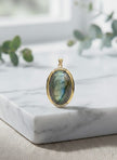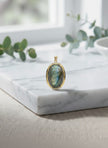 Ce pendentif est un bijou composé d'une pierre de labradorite de forme ovale, sertie dans un cadre en métal précieux, argent plaqué or , et entourée de zircons. La labradorite est connue pour ses reflets irisés et ses propriétés métaphysiques, souvent utilisée pour ses vertus protectrices et énergétiques. Les zircons ajoutent une touche d'éclat et de sophistication au pendentif.