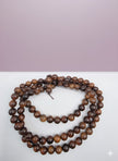 Un collier mala est un type de chapelet utilisé principalement dans les pratiques spirituelles et méditatives. Il est composé de perles, souvent en bois, en graines ou en pierres semi-précieuses. Le mala présenté dans l'image est de couleur marron, probablement fabriqué à partir de bois ou de graines naturelles.