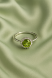 La bague sur l'image est une bague en argent avec un péridot au centre, entouré de pierres de zircon. Le péridot est une pierre précieuse verte souvent utilisée dans les bijoux pour sa couleur vive et sa clarté. Les zircons sont des pierres synthétiques qui imitent les diamants et ajoutent de l'éclat à la bague.