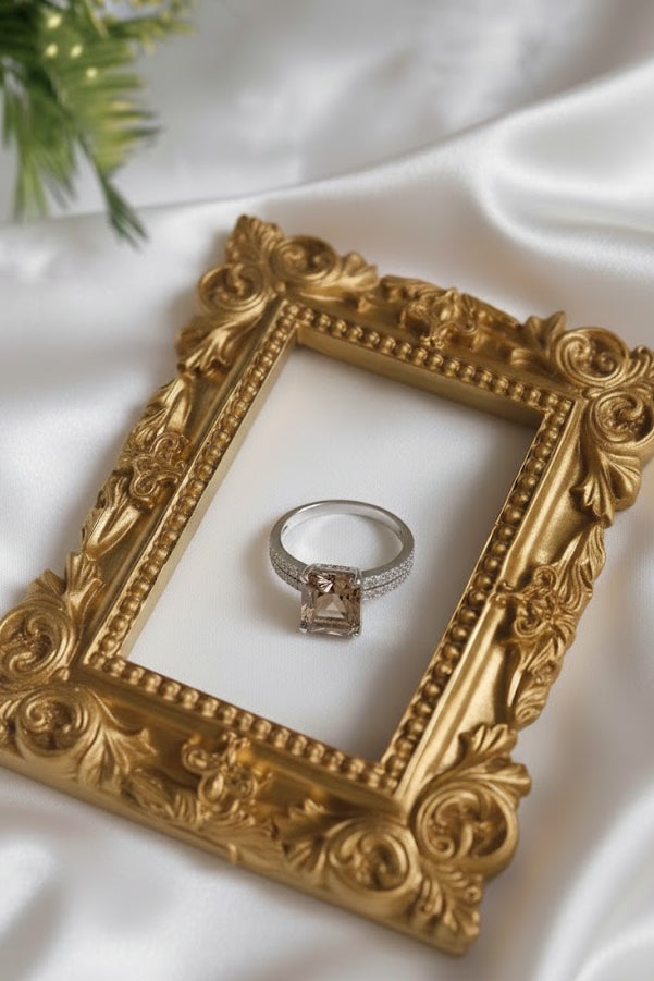 La bague présentée est une bague en argent avec un quartz fumé serti au centre. La pierre centrale est entourée de petites pierres de zircon qui ajoutent de l'éclat à l'ensemble. Le design est élégant et sophistiqué, parfait pour diverses occasions.